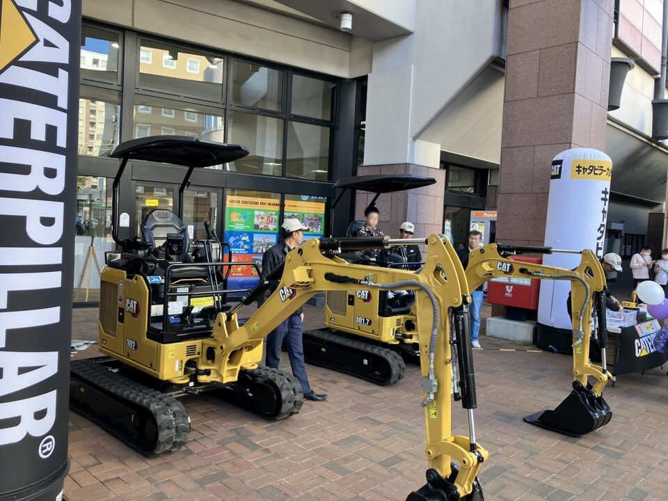 当社のブースでは、ミニ油圧ショベルの展示とキャタピラーラジコン🎮でのあめ玉すくいを行いました。